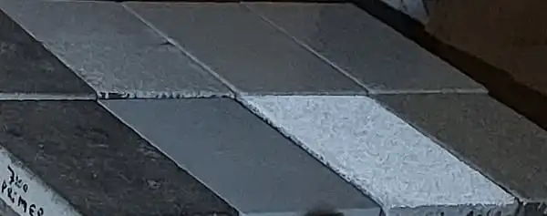 2. Balkongmaling Sikafloor 420: Sterk polyuretan maling som ikke sprekker opp og som brukes på betong gulv-plattinger utendørs. Gir en vanntett, værbestandig, meget sterk og holdbar malingsfilm. Den tykkeste av malingene vi brukte og trenger derfor de groveste korningene for å få god sklisikring. Fargen på prøvene er RAL 7042