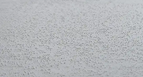 9. Epoxy gulvmaling med glassperler (7) i toppstrøk: Malingen må mettes med glassperler for at det skal bli fint. Er ruglete i overflaten, men oppleves samtidig glatt. Men glassperlene gjør at på denne lyse fargen, så synes den veldig godt i mørket. Det bilde der en hvit prøve skiller seg ut, er tatt uten blitz og nesten i mørket for det blotte øyet. Alle prøvene som ligger rundt er malt i nesten hvit farge, se hvor godt den prøven med glassperler skiller seg ut.