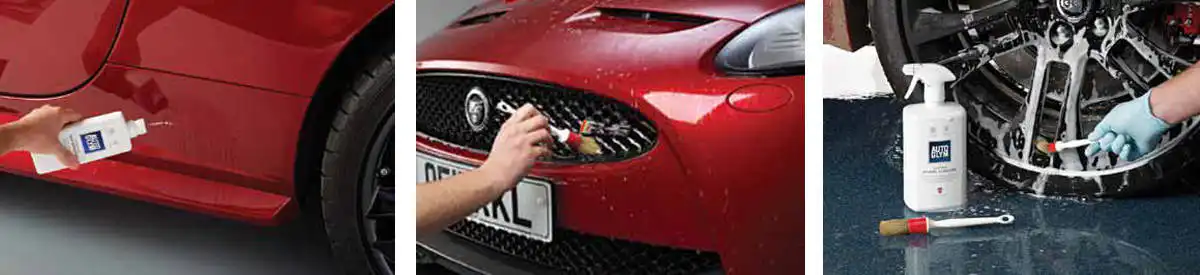 Siste del av forvasken: Når du bremser, oppstår det friksjon mellom bremseskivene og bremseklossene. Denne friksjonen får det til å oppstå støv med små metallpartikler som fester seg på og rundt felgene. Metallpartikler legger seg også andre steder på bilen, Disse metallpartiklene vil etter kort tid ruste, og kan i verste fall grave seg inn i lakken. Du kan lese mer om rust i denne artikkelen. Det er derfor nyttig og gå over bilen med en metallpartikkelfjerner på de samme stedene som du har brukt Tar Remover eller Autoglym Forvask, altså nederst på bilen og opp til rutene. Gjør dette etter at bilen har lufttørket litt. Gi felgene litt ekstra oppmerksomhet og gå over flere ganger med metallpartikkelfjerneren og gjerne en pensel for å jobbe middelet godt inn på felgen til du er fornøyd med resultatet. Ønsker du en rimeligere variant av metallpartikkelfjerneren, kan du se på Selaclean Iron X-it Flyverustfjerner.