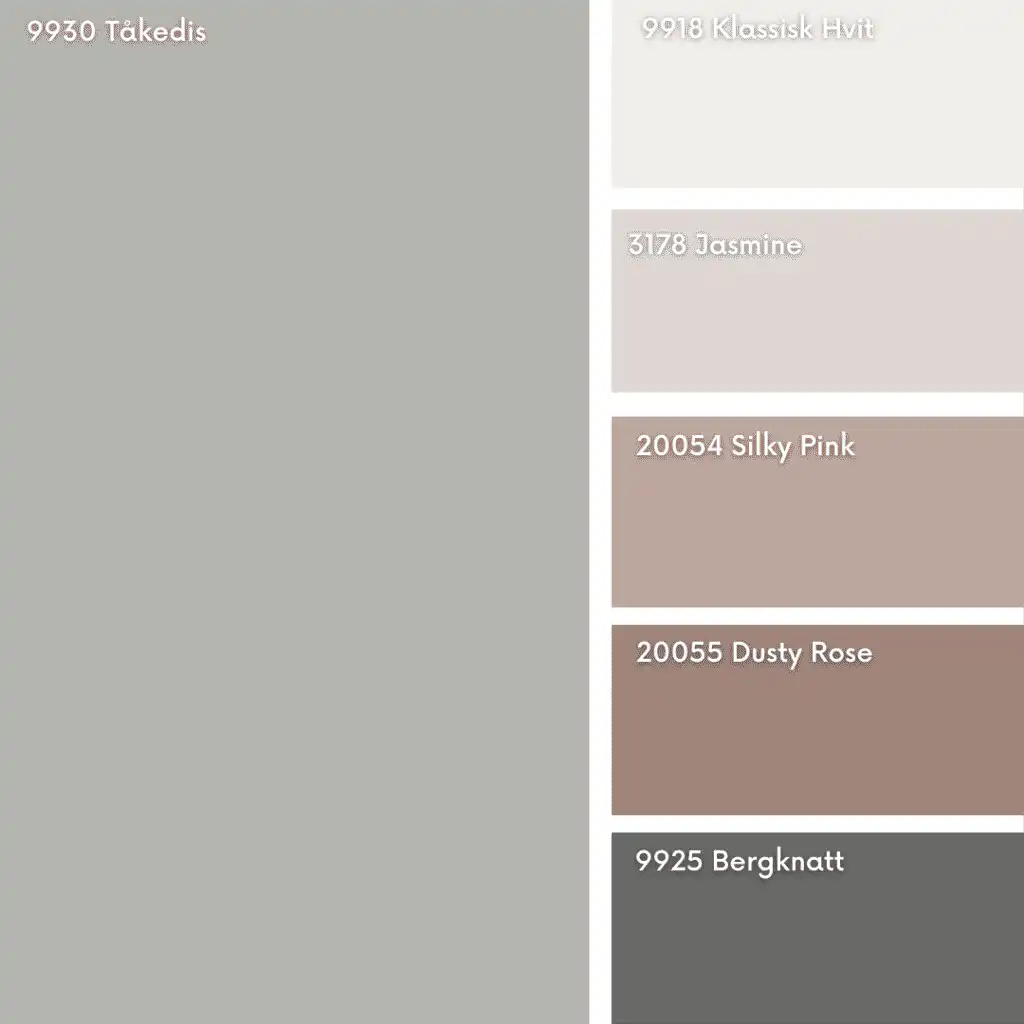 9930 Tåkedis NCS S3000-N er en nøytral og kjølig gråtone. Spennende til rosatoner som: