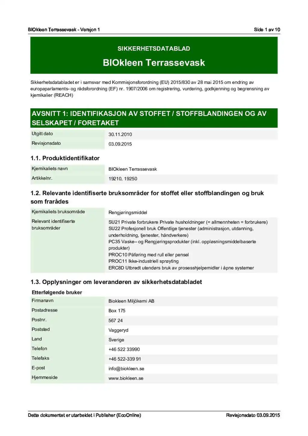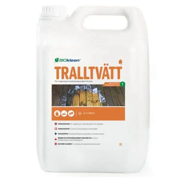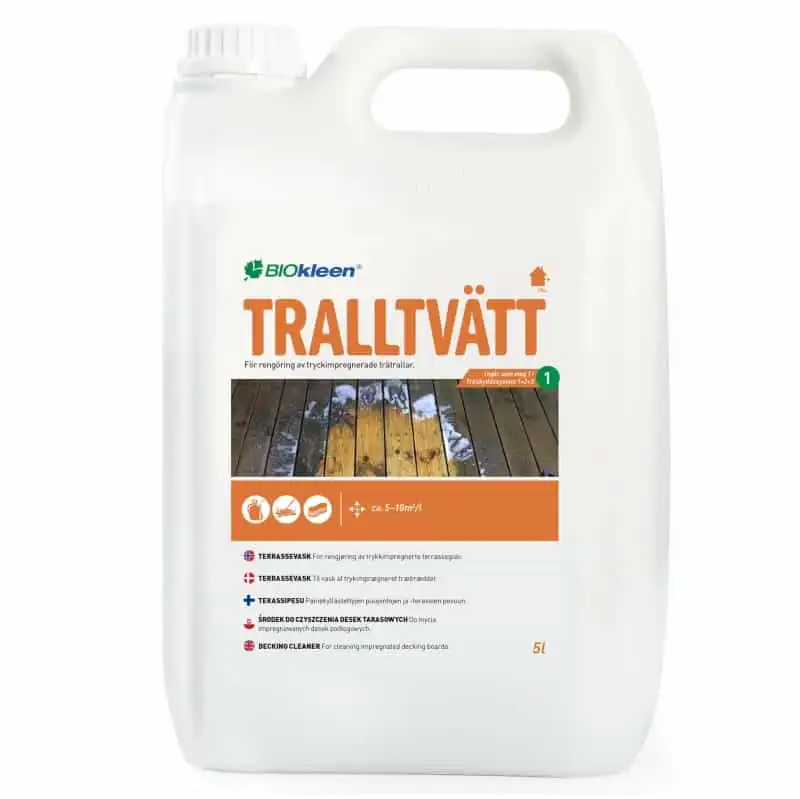 Biokleen Terrassevask 5 liter er en miljømerket rengjøring av trykkimpregnert tre. Produktet brukes til å rengjøre uteplassen og er spesielt effektivt for rengjøring av trykkimpregnert tre med et kraftig belegg av smuss, sot og / eller alger.
