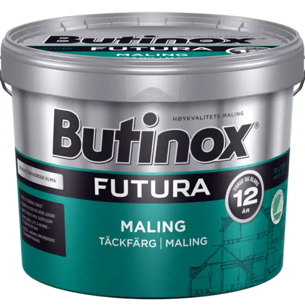 Butinox Futura Maling er halvblank høykvalitetsmaling som gir meget god værbestandighet og lang holdbarhet, i tillegg til langvarig farge- og glansstabilitet. Det gjør at huset ser nymalt og vakkert ut svært lenge. Butinox Futura Maling gir 12 års garanti på farge og glans.