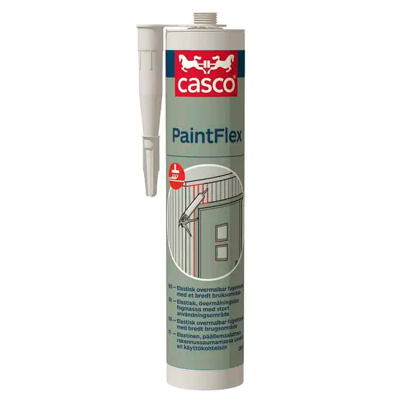 Casco Paintflex overmalbar elastisik fugemasse er en overmalbar fugemasse for innen- og utendørs bruk. PaintFlex er en 1-komponent elastisk fugemasse basert på Sikas nye patenterte teknologi. Benyttes til elastisk tetting og fuging av bygninger med moderate krav til bevegelse. Meget gode overmalbare egenskaper og er mye mer elastisk enn akryl. Glattes ut med vann.