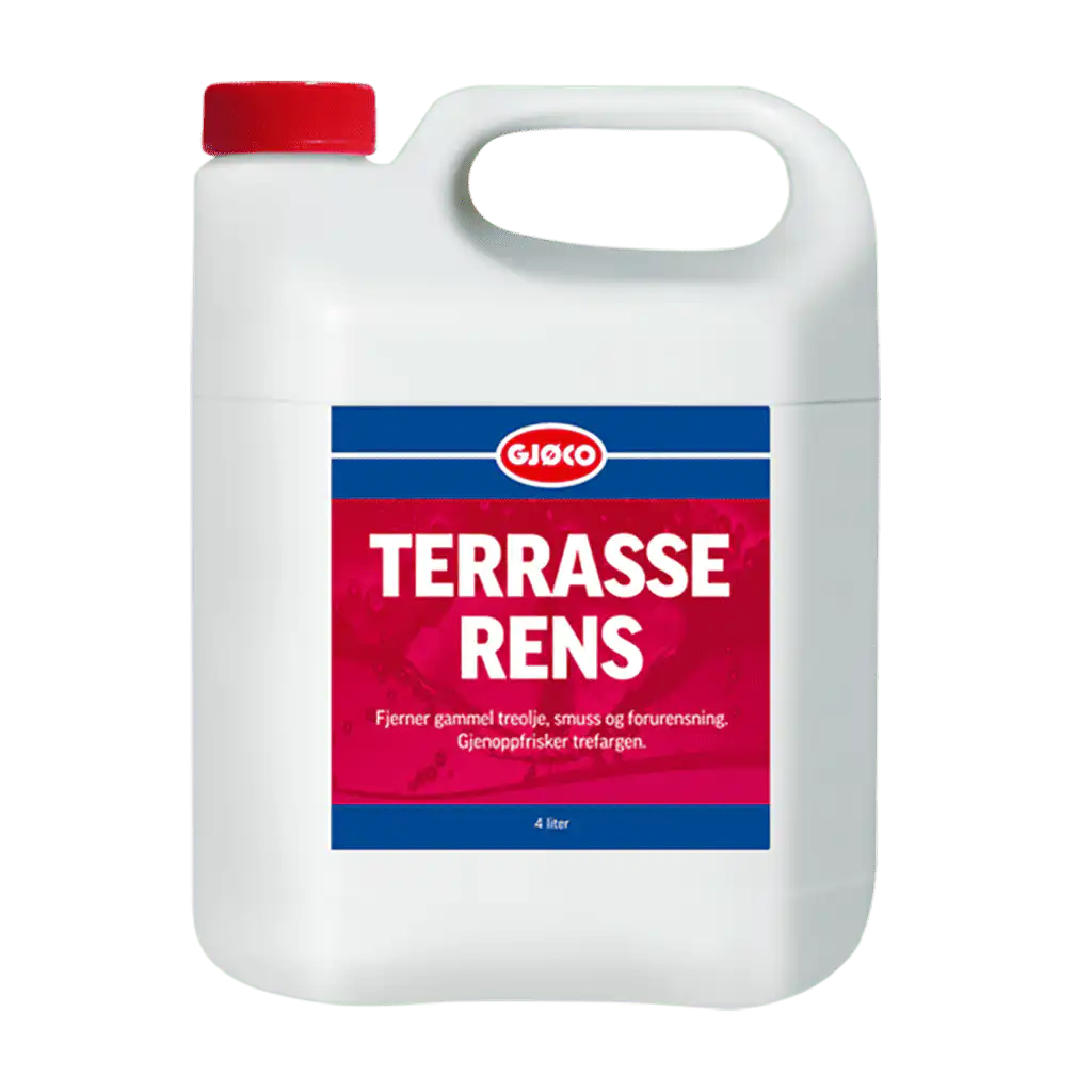 Gjøco Terrasserens er et sterkt, alkalisk rengjøringsmiddel for fjerning av gammel treolje, smuss og forurensning. Gjenoppfrisker trefargen på terrassebord og hagemøbler. Brukes på terrasser og hagemøbler. Må ikke brukes på edeltre. Unngå at Gjøco Terrasserens kommer i kontakt med planter, malte flater, aluminium og glass. Eventuelt søl spyles bort med rent vann.
