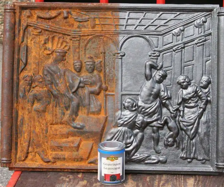 Grafittkrem Liberon Ovnsverte Iron Paste 250 ml før og etter bruk av grafittkrem