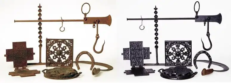 1. Fjern løs rust med en stålbørste/bronsebørste og fjern eventuell gammel ovnspuss med Liberon Møbelrens. Gjenstanden er nå klar til behandling.