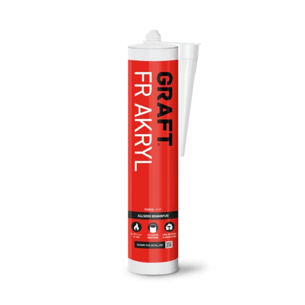 GRAFT FR Akryl 310ml hvit er en allsidig, hvit brannklassifisert fugemasse utviklet for profesjonell bruk i bygg og anlegg. Den brukes primært for å hindre spredning av flammer, røyk og lyd gjennom fuger og tekniske gjennomføringer. Farge: Hvit (RAL 9002 / NCS S1002-Y)