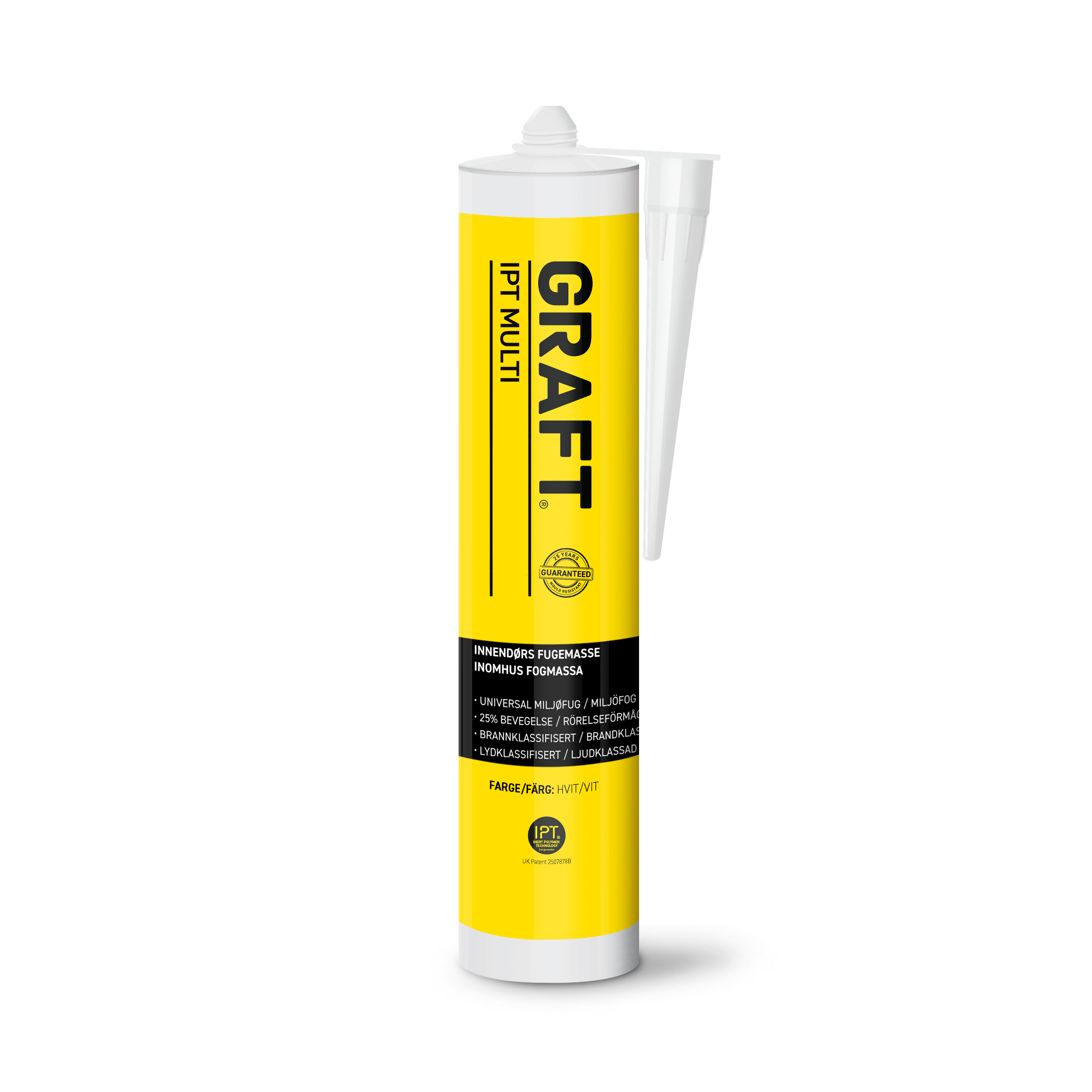 Graft FR IPT Fugemasse er en allsidig miljøtilpasset brannfugemasse, perfekt for våtrom. Dens unike teknologi Inert Polymer Technology (IPT) er helt fri for farlige avgasser og kjemikalier. Den tar i mot alle bevegelser, gulner ikke og har en fantastisk holdbarhet.