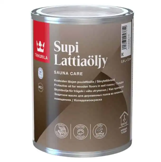 Supi Lattiaöljy Badstu Gulvolje beskytter treverk mot fukt og skitt, samtidig som den reduserer sprekkdannelse i treverket. Supi gulvolje er basert på vegetabilsk oljer og inneholder antimuggmidler som beskytter overflaten. Kan også brukes på varmebehandlet treverk og hardved som eik og ask.