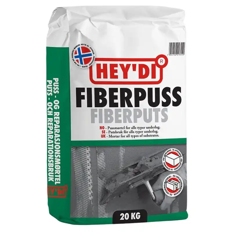 Hey’di Fiberpuss er en sprøytbar fiberforsterket tørrmørtel laget av spesialsement, kalk, gradert sand og tilsetningsstoffer. Hey’di Fiberpuss har god vedheft og fleksibilitet. Skal kun blandes med rent vann for å få en bruksferdig mørtel.
