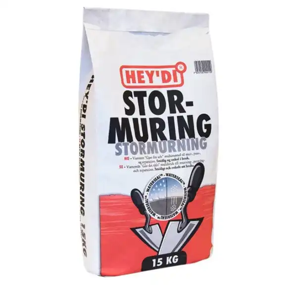 Hey’di Stormuring er en fiberarmert vanntett universalpuss til alle puss og reparasjonsarbeider på mur, tegl, lettklinker (Leca) og betong, ute og inne.