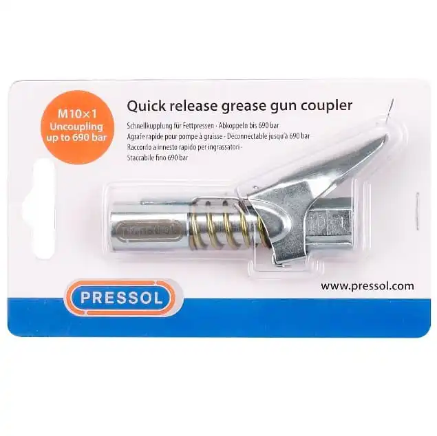 Hurtigkobling for fettpresse Quick release Pressol M-10 gjør det enkelt og feste fettpressen til nippelen, samtidig som du alltid får koblet deg. Med en ordinær nippelkobling så kan du ofte få problemer med å koble deg av nippelen