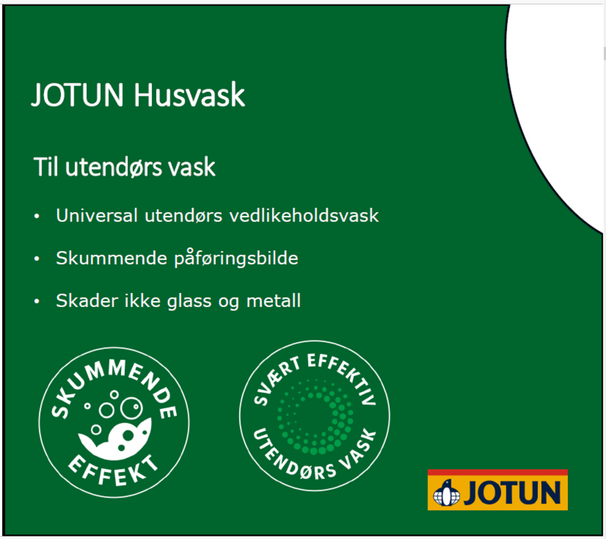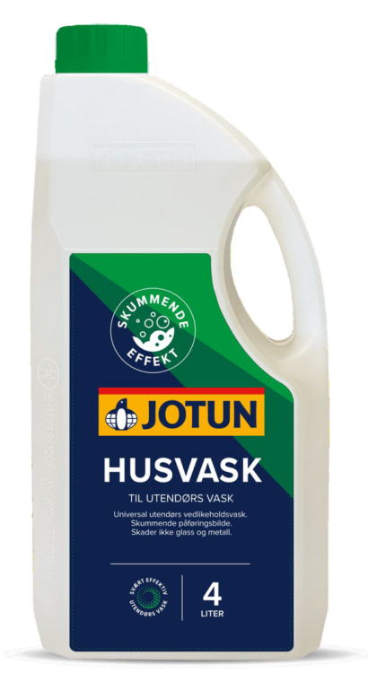 JOTUN Husvask er den perfekte løsningen for den årlige vedlikeholdsvasken av fasade, terrasse og hagemøbler. Med sin kraftige og sterkt skummende formel, fjerner den effektivt smuss, alger og forurensning – samtidig som den ikke skader glass eller metall.