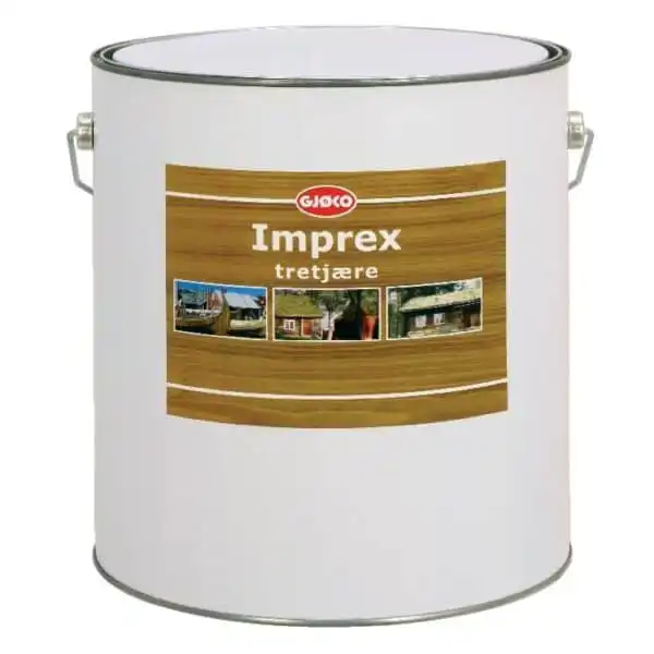 Imprex TreTjære Brun Gjøco 10 liter, er en lys og vannavvisende blandingstjære. Gjøco Imprex tretjære brukes som impregnering, spesielt til gammelt treverk. Kan også brukes på trykkimpregnert trevirke og til impregnering av rep og tauverk. Tretjære gir treverket et vakkert eksklusivt utseende.