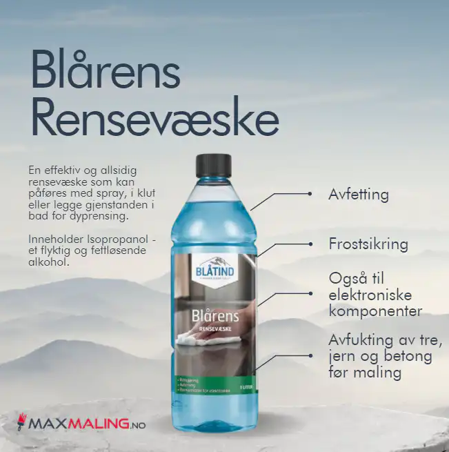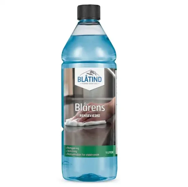 Blårens Blåtind – Rengjøring uten rester 1 L er en effektiv rensevæske, avfetting, frostsikring m.m. Den fordamper fort og etterlater ingen rester. Kan blandes med vann i alle forhold til f.eks ønsket frysepunkt.