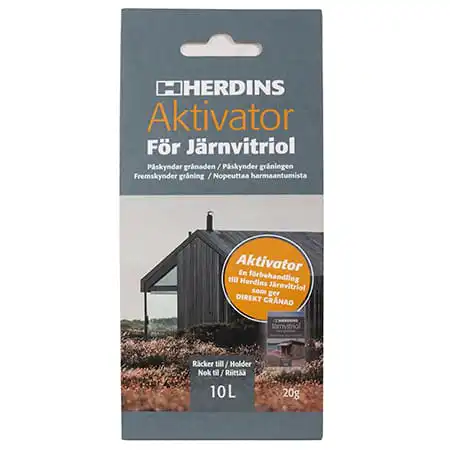 Jernvitrol – Jernvitriol Aktivator 20 gram dekker 30 – 60 m2 fremskynder prosessen til Jernvitrol. Du får den gjennkjennelige gråfargen som Jernvitrol lager, uten å måtte vente på sol, fuktighet og rett temperatur. Brukes på ubehandlet treverk og impregnert treverk, men kun på stående flater ikke terrassegulv o.l