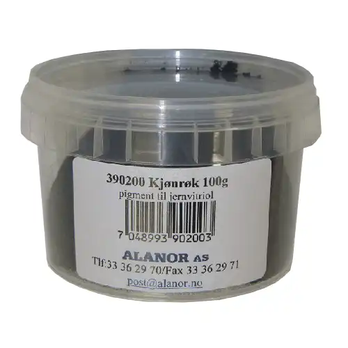Kjønrøk 100 gr (lampesort) er svart pigment til jernvitriol, tjære, linolje, vegetabilsk terpentin og andre naturlige produkter.