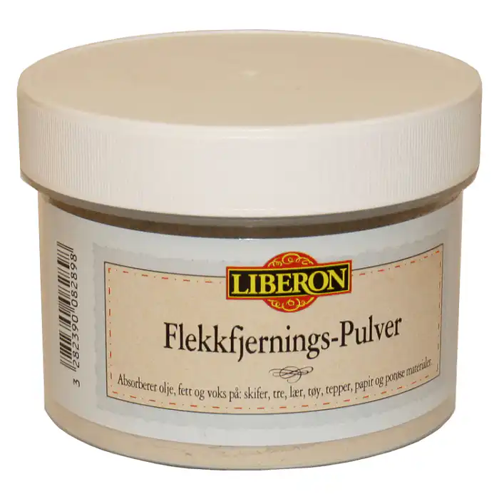Liberon Flekkfjerningspulver er et spesialprodukt for å fjerne flekker av olje, voks og fett på skifer, tre, lær, tøy, tepper, papir og porøse materialer.