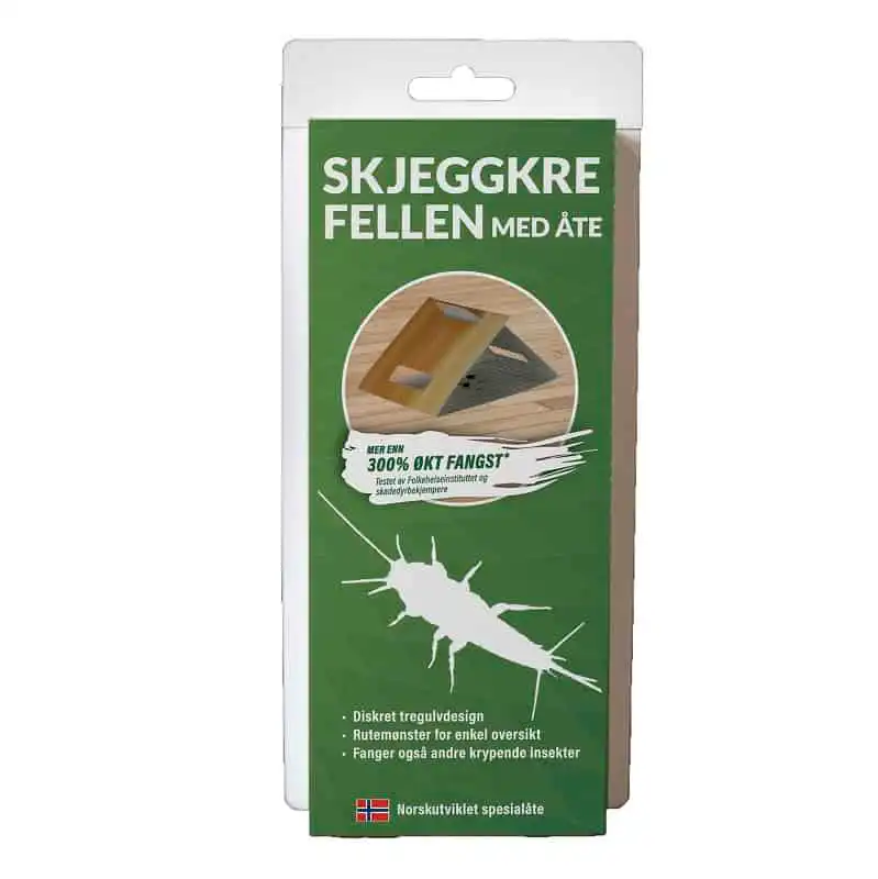 Limfeller Skjeggkre feller med Åte, inneholder 9 stk limfeller med norskutviklet spesialåte som er testet i samarbeid med profesjonelle skadedyrbekjempere og Folkehelseinstituttet. Skjeggkrefelle med åte, oppnår mer enn 300% mer fangst, enn limfeller Skjeggkrefelle uten åte.