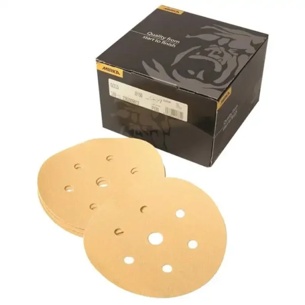 Mirka Gold kommer i flere størrelser: Rondell Ø225 mm, Rondell Ø150 mm 7 hull, Rondell Ø150 mm 15 hull, Rondell Ø150 mm 17 hull, Rull Gold Proflex 115 mm x 50 meter.