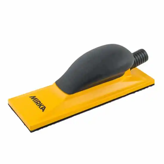 Mirka Håndslipekloss har lavt og godt grep, og 22 hull i slipeplaten med forbindelse til støvutsuget bak håndtaket. Dette gjør at støv blir sugd godt ut og gir deg en støvfri sliping ved bruk av abranet og støvsuger. Slipeplaten har borrelås, og passer for alt slipemateriell med «grip» bakside.