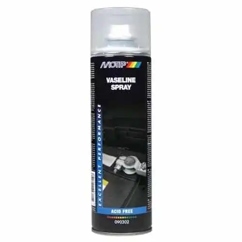 Brukes på batteripoler og andre overflater som ønskes beskyttet. Kan også brukes som konserveringsspray på båtmotor og lignende.Vaselin spray er vannavstøtende, pH-nøytral og motstandsdyktig mot vær og vind og svake syrer og baser. Vaselin spray har utmerket korrosjonsbeskyttelse og hindrer slitasje. Motip Vaselinolje Spray er motstandsdyktig mot temperaturer på – 30 ° C opp til + 160 ° C.