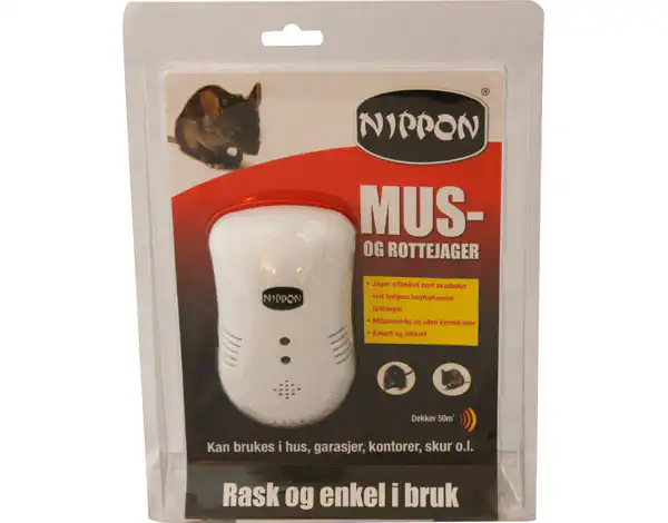 Nippon mus- og rottejager sender ut høyfrekvente bølger som vil holde mus, rotter og kravlende insekter borte. Lyden oppfattes ikke av mensker eller husdyr.