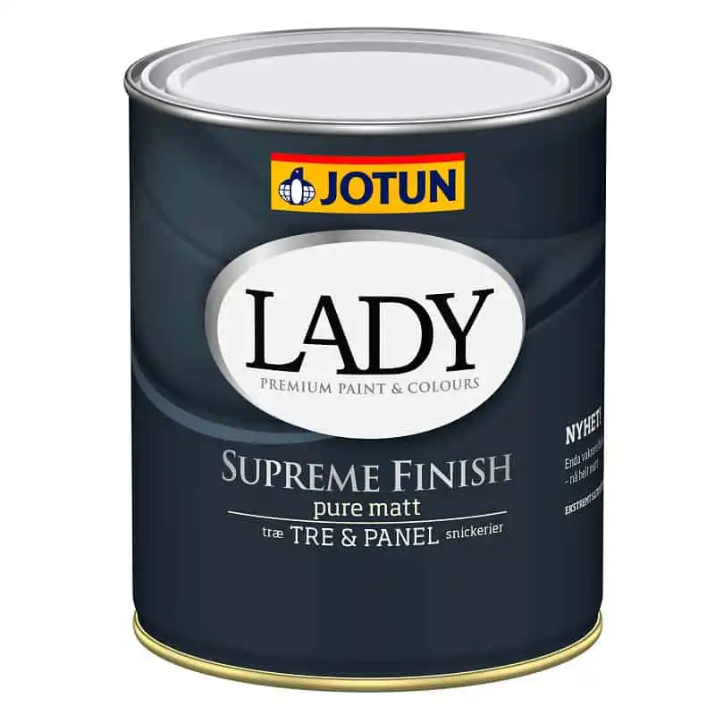 Jotun Lady Supreme Finish – Tre og Panelmaling gir overflater av tre en jevn og vakker overflate. Lady Supreme Finish har en suveren utflyt og etterlater seg en vakker overflate som fremstår perfekt. Malingen  er en luktsvak, vanntynnet polyuretanmodifisert oljemaling for innendørs bruk på treverk, panel og metall.
