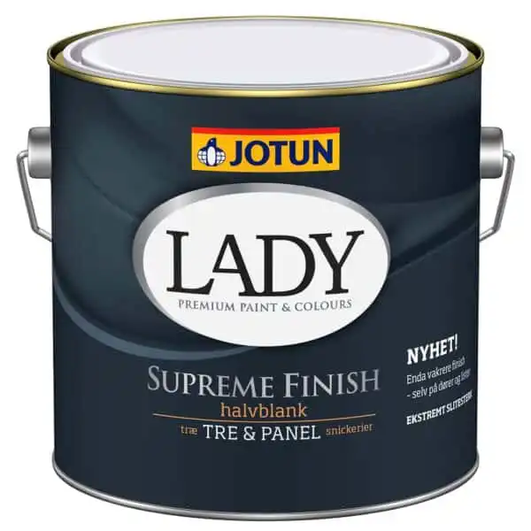Jotun Lady Supreme Finish gir panel, listverk, møbler, dører og vinduskarmer en jevn og vakker overflate. Malingen er en luktsvak, vanntynnet polyuretanmodifisert oljemaling for innendørs bruk på treverk, panel og metall.