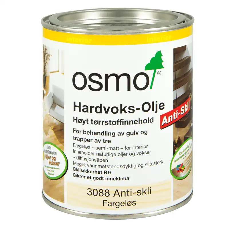 Osmo Anti-Skli Hardvoksolje 3088 R9 SemiMatt 0,75 liter gir ekstra sklisikring på innvendige gulv og gir sklisikring tilsvarend R9. Osmo Hardvoksolje Antiskli passer godt for offentlige rom, og er like egnet for heltre, som parkett, OSB eller kork.