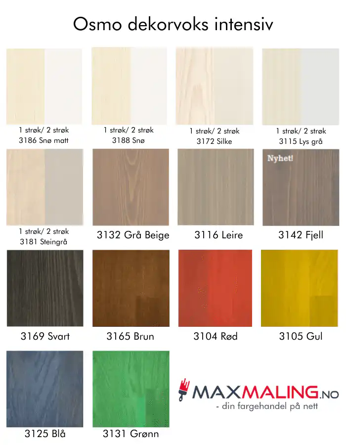 Osmo dekorvoks Intensiv kommer i følgende farger og alle kan blendes med hverandre. 3165 Brun blir ikke å få tak i når det er tomt på lager. Ønsker du svakere farger kan du velge Osmo dekorvoks Transparent.