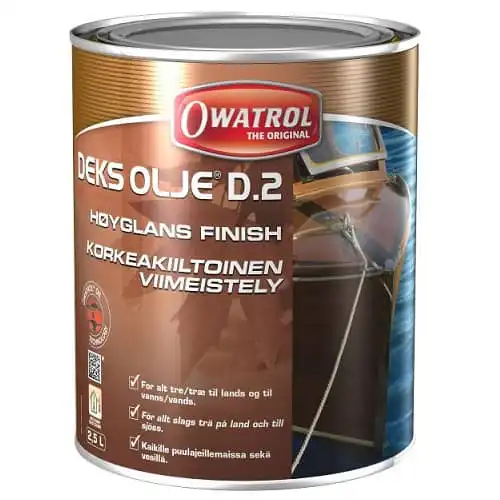Owatrol D.2 Deks Olje gir en fleksibel film som ikke sprekker, skaller av eller flasser. Høyglans finish til bruk innendørs og utendørs. Svært transparent olje – forsterker den naturlige skjønnheten i treverket. Langtids beskyttelse. Ingen sliping mellom strøkene. Enkelt vedlikehold. Enkel reparasjon, ingen stripping.