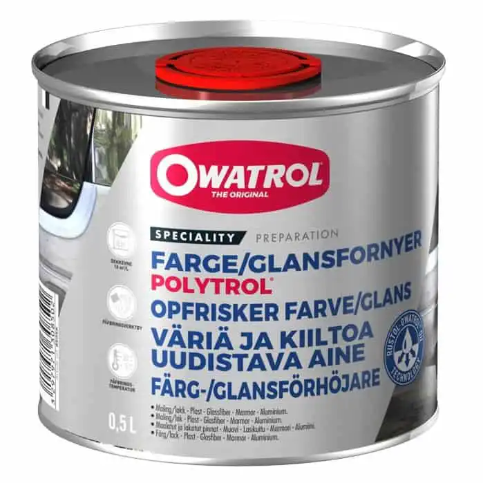 OWATROL Polytrol fargefornyer – Mast Restorer – Gelcoat Restaurer 0,5 liter (Samme produkt). Polytrol gir umiddelbart tilbake den opprinnelige farge og glans, kan brukes på maling, gelcoat, plast, frontlykter, stein, marmor, taksten, aluminium osv.