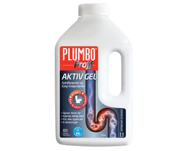 Plumbo Avløpsåpner Aktiv Gel proffversjon er sterk, tung og tyktflytende gel avløpsåpner. Kombinasjonen av høy egenvekt og gel konsistens, gjør at den synker konsentrert gjennom vann, og effektivt løser propper av hår, matrester, såpe og fett. Ekstra godt egnet på baderom og avløp med lite fall. Kan også brukes i toaletter.