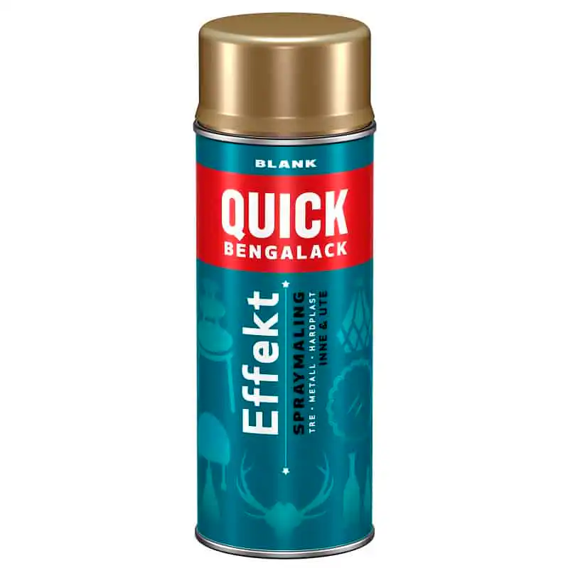 Quick Bengalack Effektspray gir nytt liv til ting du elsker. Skap blikkfang med en brilliant metallic effekt. Sprayen gir en flott, hard, blank og slitesterke overflate som tørker fort. Raskt og enkelt!
