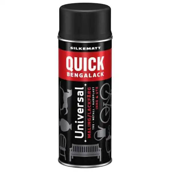 Quick Bengalack Spray Universal i silkematt glans gir nytt liv til ting du elsker. Sprayen gir en flott, hard, silkematt og slitesterk overflate som tørker fort. Raskt og enkelt! Produktet kan brukes på så og si alt og kan brukes både innendørs og utendørs. Velg blant flere flotte trendfarger!