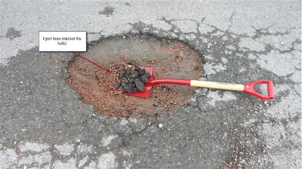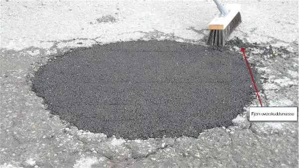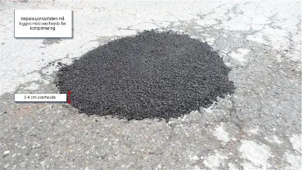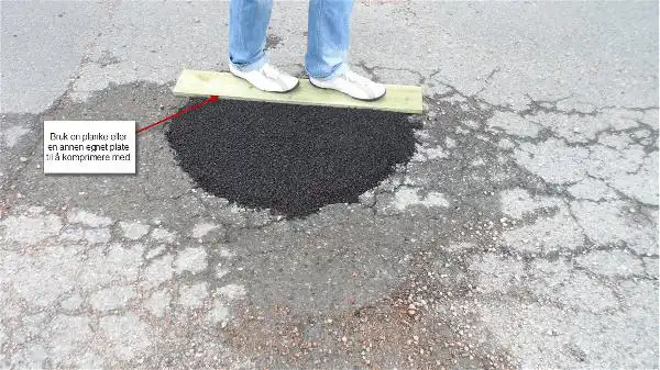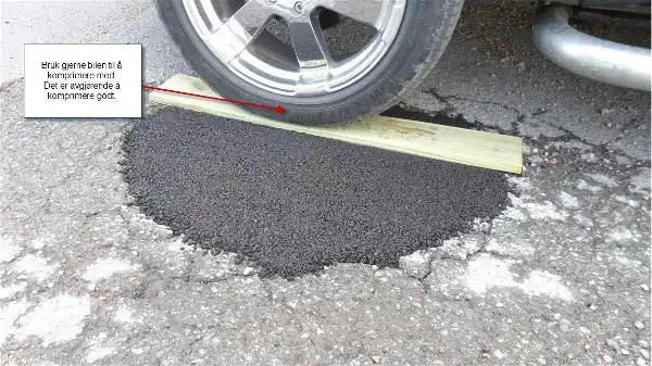 Reparasjonsasfalten inneholder bindemidler som fester ekstra godt til bunnen og kantene i hullet. Massen er klar til bruk umiddelbart etter stamping.