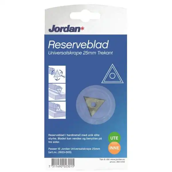 Reserveblad Jordan trekantskrape Universal 25 mm 1 stk. Reserveblad til bl.a Malingskrape Universal 25 mm, 1 stk Jordan trekantet skrapeblad i hardtmetall med unik slitestyrke. Den kan brukes på alle tre sider før den må byttes.