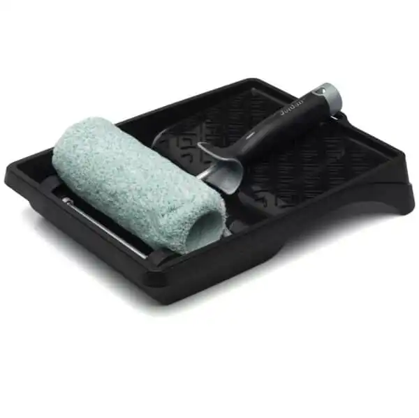 Rullesett Jordan Ultimate Vegg og tak – jevne flater 18 cm inneholder det man trenger for påføring av maling med rull; rullebøyle i aluminium, Ultimate malerull, malerullkar og et engangsinnlegg for rullekar.