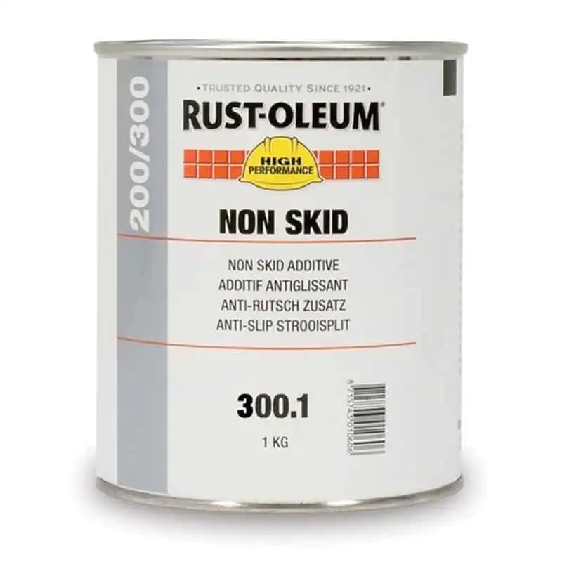Rust-Oleum NS 300.1 Antiskli tilsetning i maling 1 kg kan blandes i de fleste 2-komponente malinger og gir en holdbar sklisikker overflate. Gir en veldig sklisikker overflate om den drysses over påført våt maling/belegg. Tåler biltrafikk