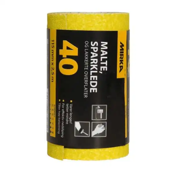 Sandpapir Treverk – Hard maling Mirka Mirox 115mm x 2,5 meter er et tørrslipepapir for håndsliping av både bløte og harde treslag, metall og kompositt. Takket være den fleksible konstruksjonen egner Mirox seg godt til sliping av både slette og profilerte flater.