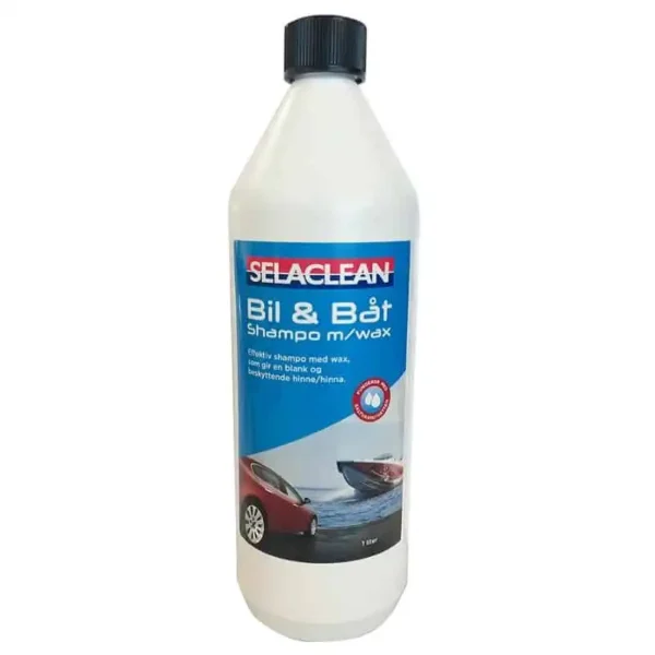 Selaclean Bil og Båtshampo m/wax 1 L er en konsentrert sjampo som er designet for å vaske og samtidig legge igjen et beskyttende lag med voks på overflaten. En 1-liters flaske er et konsentrat som rekker til ca. 35-40 bil- eller båtvask.