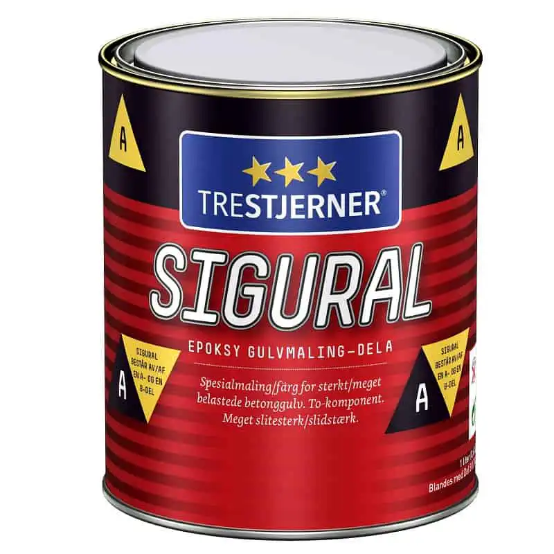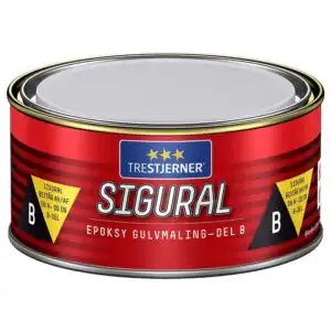 - Trestjerner Sigural Epoksy Gulvmaling består av to komponenter: Del B helles opp i Del A og røres godt sammen. Vent ca. 10 min. før blandingen tas i bruk. Blandingen må brukes innen 1,5 time.