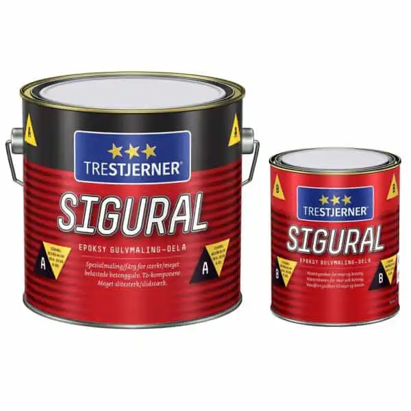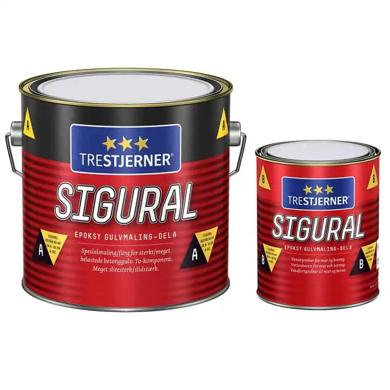 - Trestjerner Sigural Epoksy Gulvmaling består av to komponenter: Del B helles opp i Del A og røres godt sammen. Vent ca. 10 min. før blandingen tas i bruk. Blandingen må brukes innen 1,5 time.
