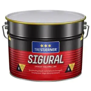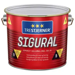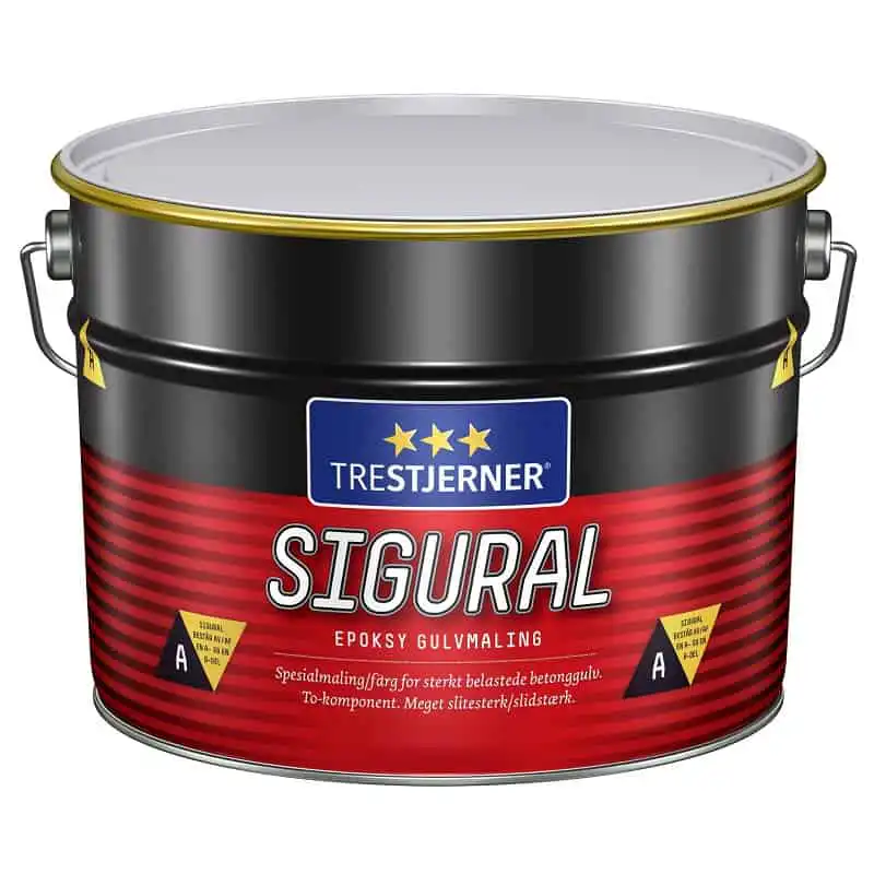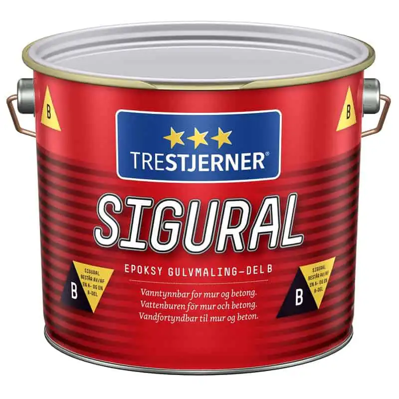 - Trestjerner Sigural Epoksy Gulvmaling består av to komponenter: Del B helles opp i Del A og røres godt sammen. Vent ca. 10 min. før blandingen tas i bruk. Blandingen må brukes innen 1,5 time.