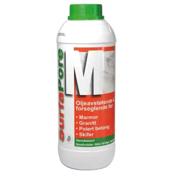 SurfaPore M impregnering Stein og Betong 1 liter er vannbasert, miljøvennlig og laget for marmor, granitt, skifer og finere betongoverflater. Surfapore M har vann-og oljeavstøtende egenskaper samtidig som den tåler høye temperaturer. Dette gjør den ideell for benkeplater, bad, skifer o.l. fordi den hindrer vekst av sopp og mugg.