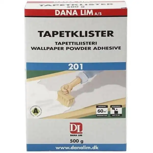 Dana Lim Tapetklister 201 er et ekstrafint, lett oppløselig pulverklister basert på stivelse, som er egnet for oppsetting av alle tapettyper i tørre rom, og passer godt til klistermaskiner.
