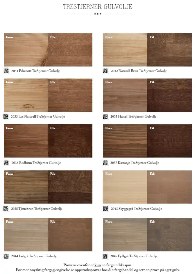 TreStjerner Gulvolje kan også benyttes til fargesetting/innfarging av gulv i kombinasjon med etterfølgende overlakkering. Benytt da 1 behandling med TreStjerner Gulvolje og 2 strøk lakk.