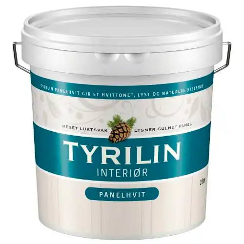 Tyrilin Panelhvit, gir deg enkelt å greit, et hvitt utseende på ditt gule panel av furu eller gran.