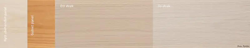 Ønskes et mest mulig transparent utseende etterstryk med fordriver umiddelbart etter påføring. Er treverket svært mørkt og gult påfør to strøk. Vær oppmersomhet på at underlagets egenfarge og sugeevne vil påvirke sluttresultatet. Rens med Tyrilin Panelrens før påføring. Gjør prøveoppstrøk før påføring på vegg/tak. Så ser du hva som blir penest hos deg!